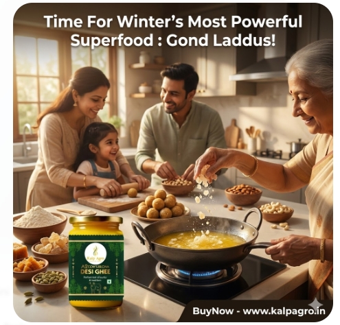 Discover why Gond Laddu made with pure A2 Cow Ghee is a powerful winter superfood. Learn its benefits for kids, elders, immunity, energy, and overall wellness. Buy pure ghee from KalpAgro.